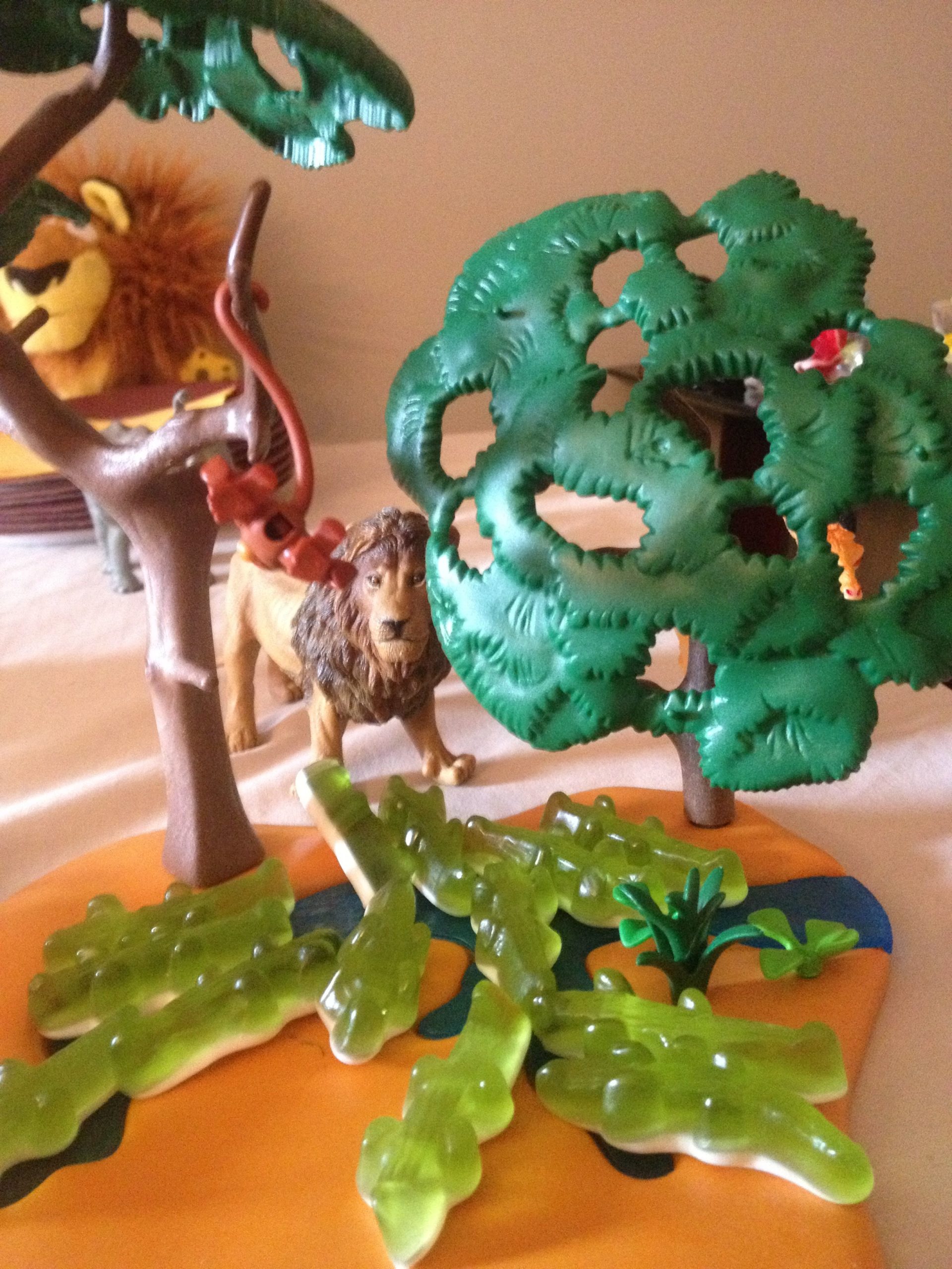 Pour décorer vos tables, j’aime beaucoup l’idée de ces petits animaux en plastique (et les bonbons crocodiles, c’est trop rigolo !) :