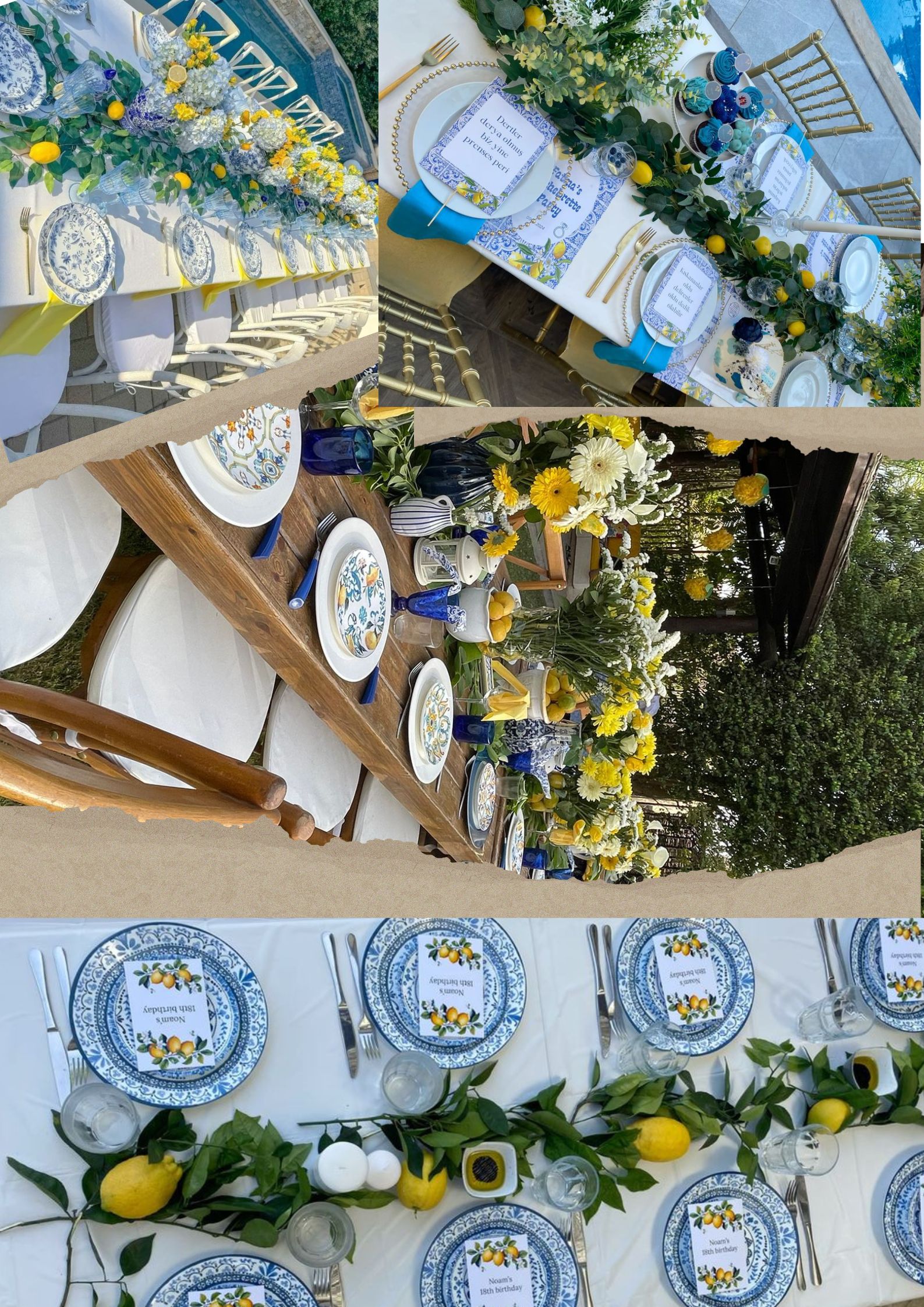 Centres de table : pots de citronniers miniatures, bouquets de fleurs blanches & feuillage méditerranéen. Nappes en lin ivoire ou à carreaux, sets de table en paille ou rotin. Vaisselle colorée type majolique ou assiettes en céramique peinte à la main. Marque-places : mini-bouteilles de limoncello, étiquettes kraft nouées à des branches d’olivier.