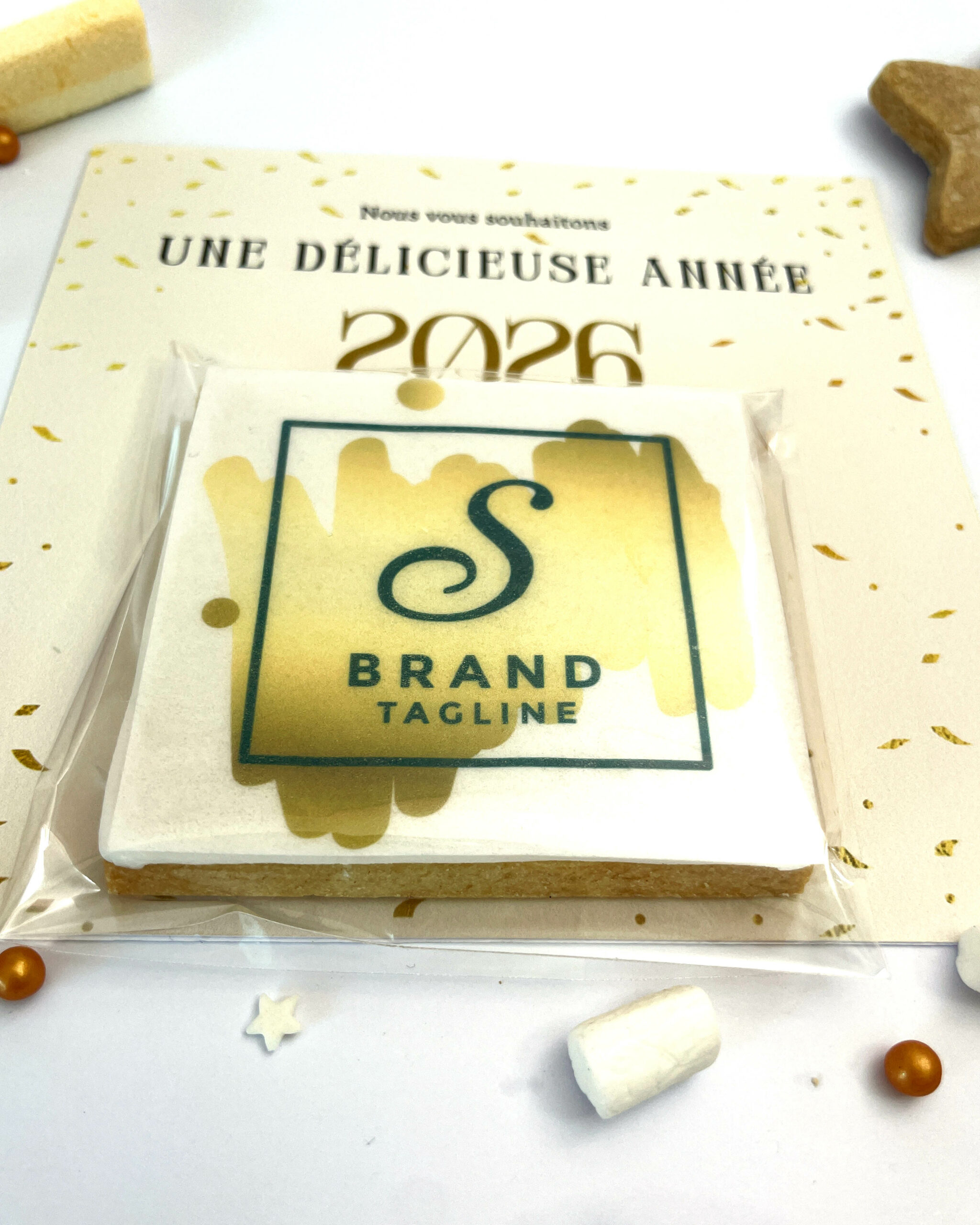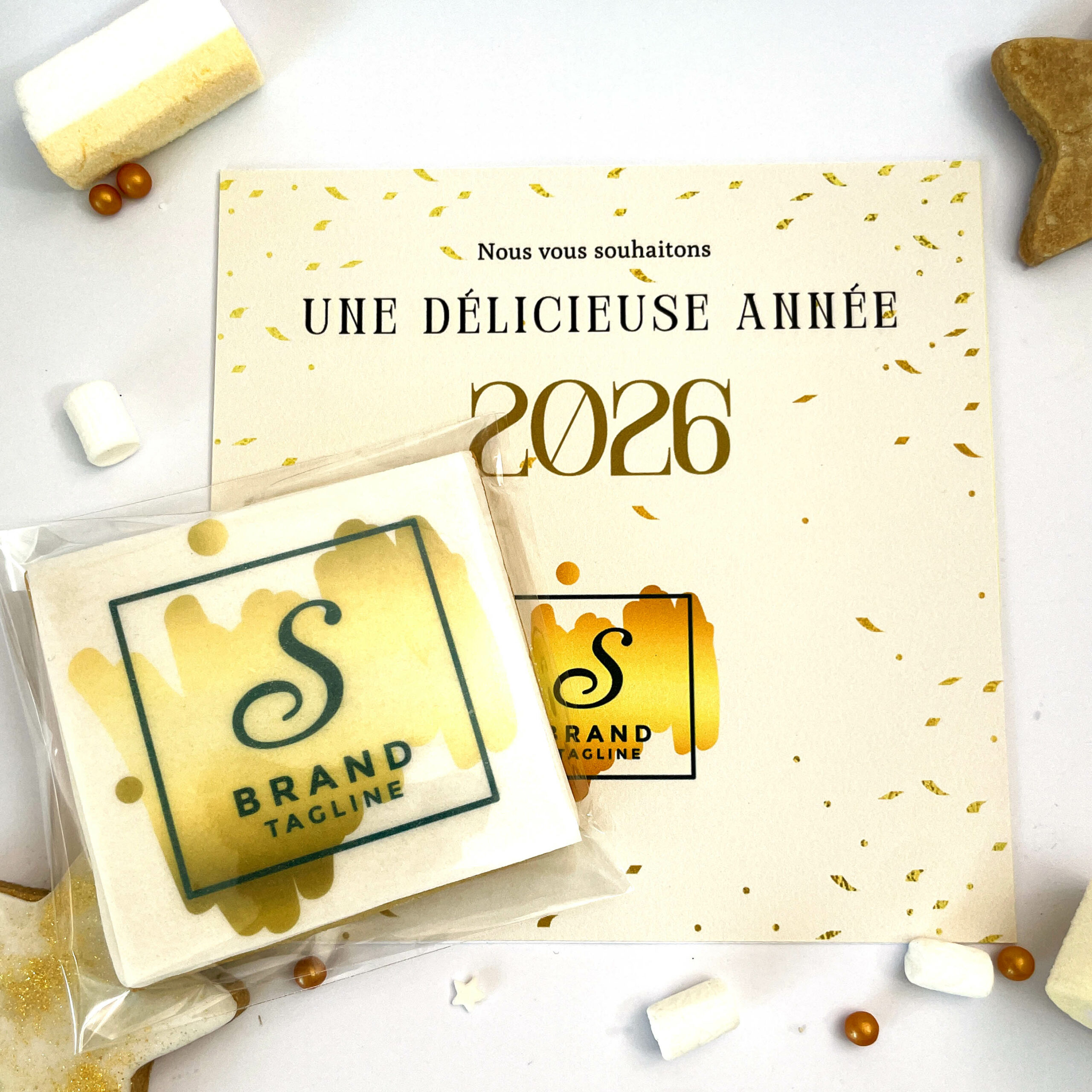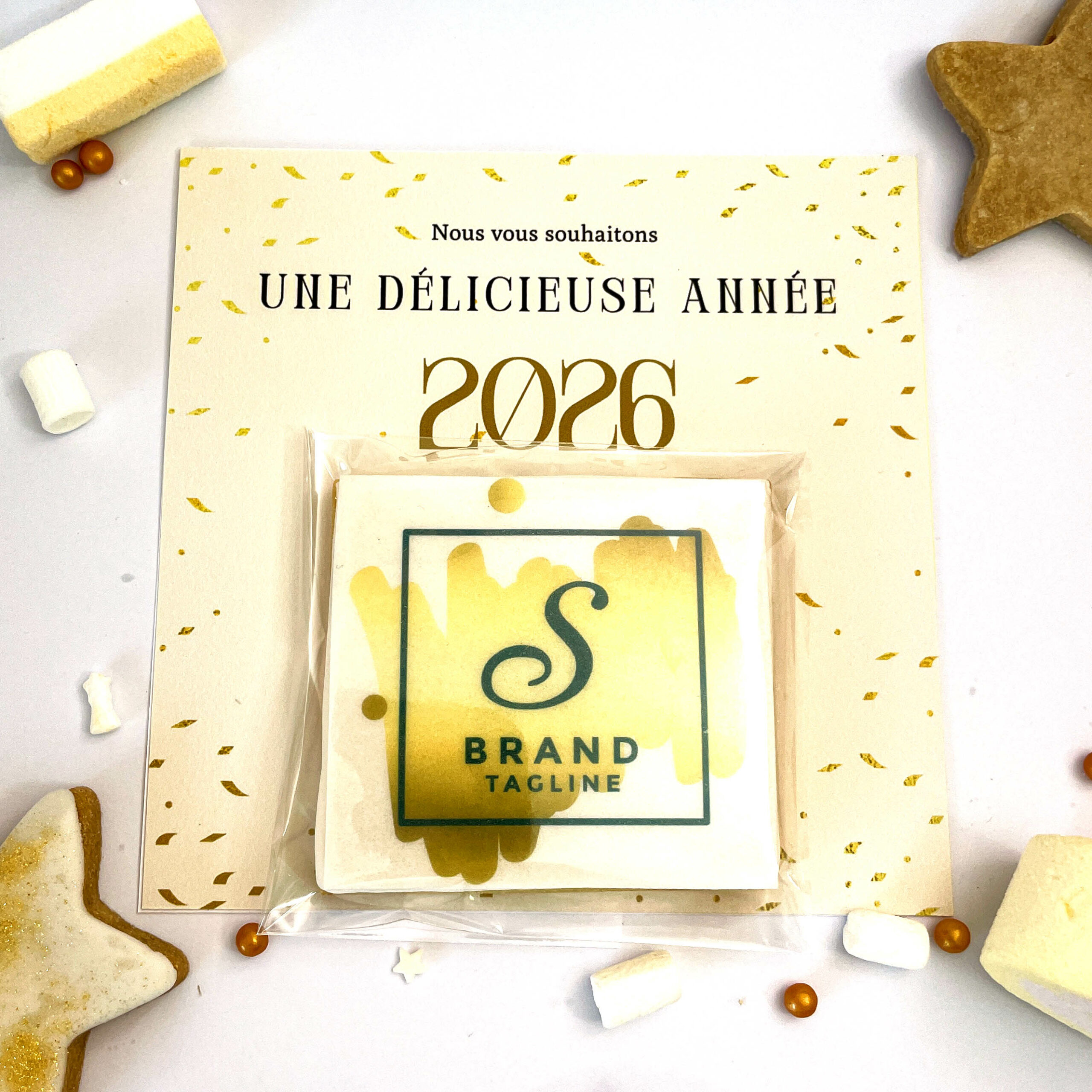 - La carte élégante : sobre et raffinée, avec un biscuit carré et le message “Une délicieuse année 2026”.
